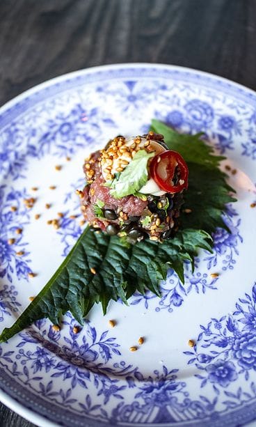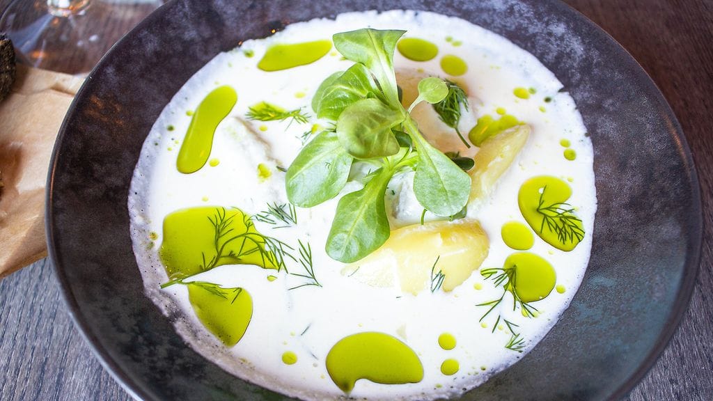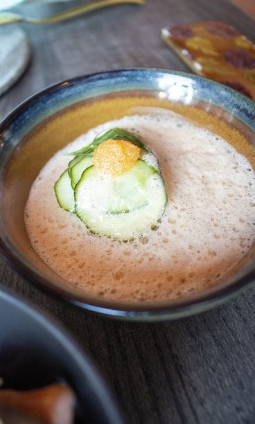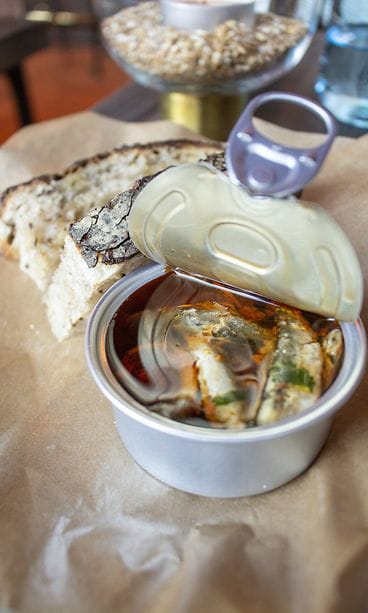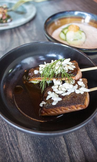 Kahden kimppaan tilaukseen boquerones eli penelopelaisittain savustettuja neulamuikkuja harissaöljyssä ja levain-leipää (eli kunnon juuripohjaista), aasialaisittain höystetty tartar, haudutettu haukipulla, muikunmätiä ja hummerikastiketta sekä hiiligrillissä grillattu nieriä-yakitori -varras, yuzua ja Penélopen dashilientä ja paahdettua riisiä. Päälle vielä kermaista madekeittoa, paistettua mateenmaksaa, tilliä ja ”pekoni-keksejä”.