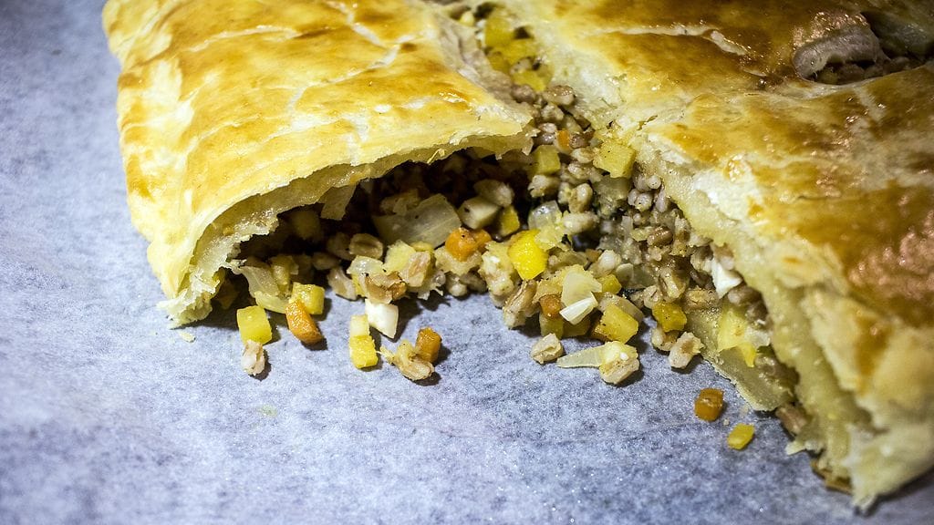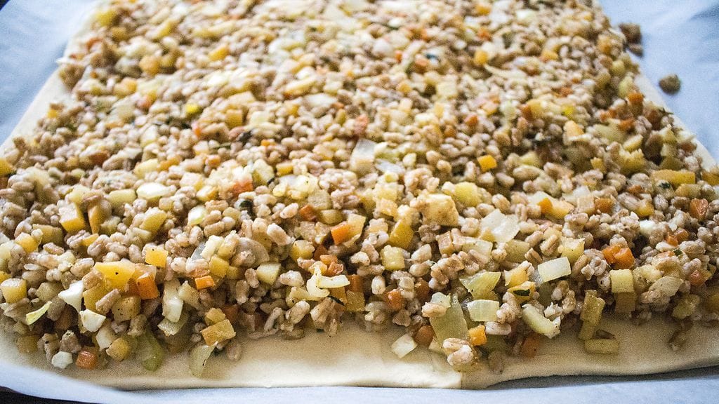 Nyt päätin tehdä piirakan kasvisversiona. Vaihdoin riisin kokojyväohraan. Se on maukkaampaa ja antaa paremman rakenteen. Lihan korvasin juureksilla. Tuli kerrassaan loistavaa.