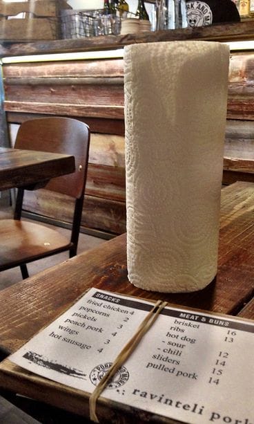 Arki-iltana klo 18 pieni paikka on puolillaan ja otamme pöydän keittiön vierestä. Sieltä näkee lähteviä annoksia parhaiten ja aistii raflan fiilistä monipuolisemmin. Ensimmäisenä huomioni kiinnittyy jokaisella pöydällä töröttävään talouspaperirullaan. Hauskan karu yksityiskohta ja vinkki rennosta ja suttaavasta meiningistä. Palvelu pelaa hyvin, kun hässäkkää ei ole. Tunnin aikana paikka on täyttynyt. Melkein kaikki asiakkaat ovat parikymppisiä. Me vanhukset tilaamme alkupaloiksi pikkelöityjä kasviksia (3 eur) sekä fried chickeniä (4 eur). Pääruoaksi slideriannos(15 eur) ja chili-hodari (14 eur). Kylkeen juustoiset ranskalaiset (5 eur) ja maissileipää (2 eur). Odottaessa lasiin mainio Basil Crush -drinkki sekä Panimo Hiisin habanerolla hauskasti aateloitu Leimaus-olut. Hanaoluita löytyy neljä, ilman ison kolmosen bulkkilageria. Nokian Panimon 66 American Pale Alea näkisin useammankin ravintolan hanatuotteena. En voisi kuvitellakaan nauttivani viiniä tässä paikassa.