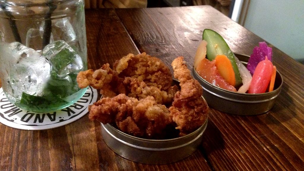 ALKUUN KAIKKI. Oluttuoppi ehtii tyhjentyä ennen ruoan saapumista. Kaikki safkat tulevat kerralla pöytään. Sinänsä harmi, koska paneroidulle kanannahkalle ja pikkelöidyille kasviksille olisi antanut mielellään ihan omaakin laatuaikaa. Kanannahka on erittäin mehevää ja parit dipit erinomaisia. Muistui heti mieleen kohu nahkalihapullista. Ihan kuin se osa olisi syömäkelvotonta. Ei se lihapulliin kuulu, mutta tällaisena mitä parhain ennakkoluulojen tappaja. Pikkelöidyt vihannekset ovat ok. Vuosi sitten olisin saanut niistä varmaankin pienimuotoiset sävärit, mutta vaimon tekemät versiot ovat pesseet nuo linkouksen kanssa. Jollet ole lajia kokeillut, kokeile. Antaa hyvän ensituntuman. Muutoin jätä väliin ja testaa kotona (bloggaan ohjeen lähitulevaisuudessa).